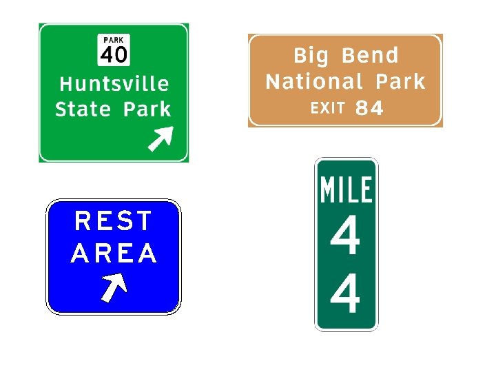 Guide Signs o Give information about roadways and routes - Mileage to a certain destination - Roadside services such as rest stops, service stations, and camp sites - Recreational areas and nearby points of interest