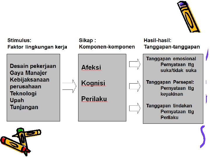 SIKAP • Kesiapsiagaan mental yang dipelajari dan diorganisasi melalui pengalaman & mempunyai pengaruh tertentu atas cara tanggap seseorang terhadap orang lain, object & situasi yang berhubungan dengannya. (Gibson, Invencevich & Donnelly) • Evaluasi kognitif & afektif yang mempengaruhi seseorang dalam bertindak dengan cara tertentu. – SUMBER SIKAP. . ? ? ?