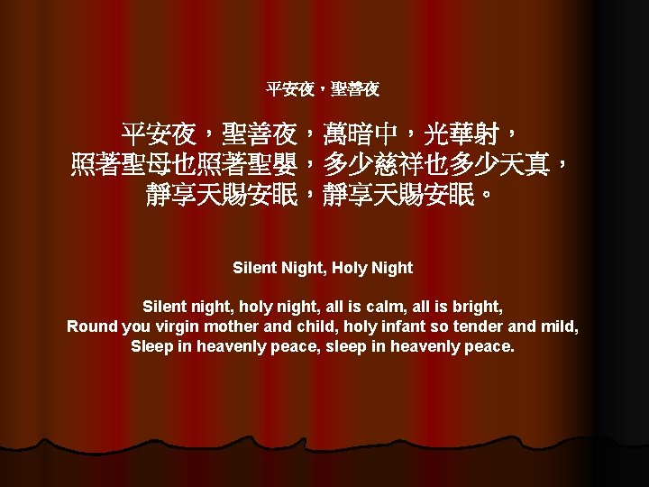 平安夜,聖善夜,萬暗中,光華射, 照著聖母也照著聖嬰,多少慈祥也多少天真, 靜享天賜安眠,靜享天賜安眠。 Silent Night, Holy Night Silent night, holy night, all is calm, all is bright, Round you virgin mother and child, holy infant so tender and mild, Sleep in heavenly peace, sleep in heavenly peace.