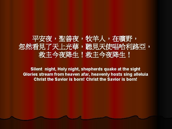平安夜,聖善夜,牧羊人,在曠野, 忽然看見了天上光華,聽見天使唱哈利路亞, 救主今夜降生! Silent night, Holy night, shepherds quake at the sight Glories stream from heaven afar, heavenly hosts sing alleluia Christ the Savior is born!