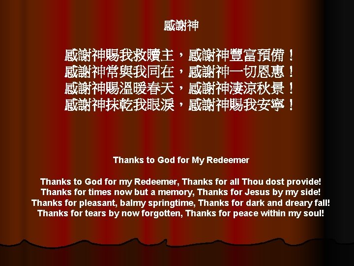 感謝神 感謝神賜我救贖主,感謝神豐富預備! 感謝神常與我同在,感謝神一切恩惠! 感謝神賜溫暖春天,感謝神淒涼秋景! 感謝神抹乾我眼淚,感謝神賜我安寧! Thanks to God for My Redeemer Thanks to God for my Redeemer, Thanks for all Thou dost provide! Thanks for times now but a memory, Thanks for Jesus by my side! Thanks for pleasant, balmy springtime, Thanks for dark and dreary fall! Thanks for tears by now forgotten, Thanks for peace within my soul!