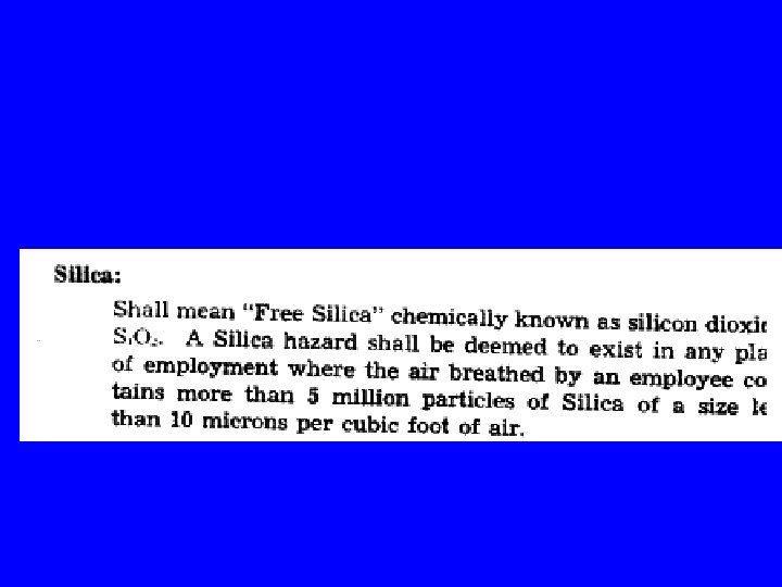 Silica Exposure • Size of particles - can it be inhaled deep into the lung? • % silica in the dust • Concentration • How much time exposed each day? • How often exposed?