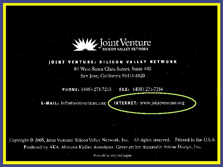 Statistical references: Joint Venture Silicon Valley 2005 Index Released January 27, 2005 San Jose Mercury News