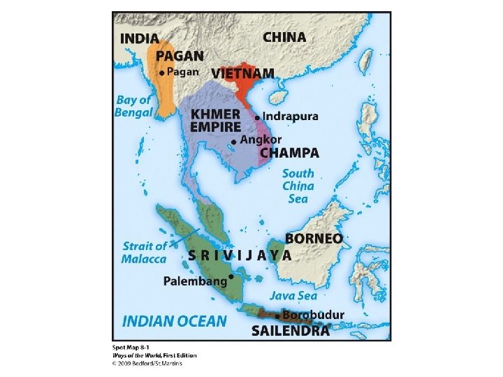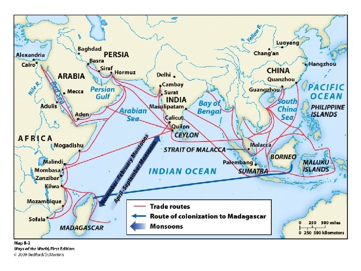 Sea routes: Exchange across the Indian Ocean • Already some trading during Indus Valley period • Egyptians and Phoenicians traded along the Red Sea • Chinese merchants reached India 100 CE • Fulcrum was India: along with trade, spread Buddhism and Hinduism in Southeast Asia. • Reunified China (Tang and Song Dynasties, 6181279) brought cheap goods and provided markets. • Rise of Islam crucial to further spread – widespread conversion made trade move more freely