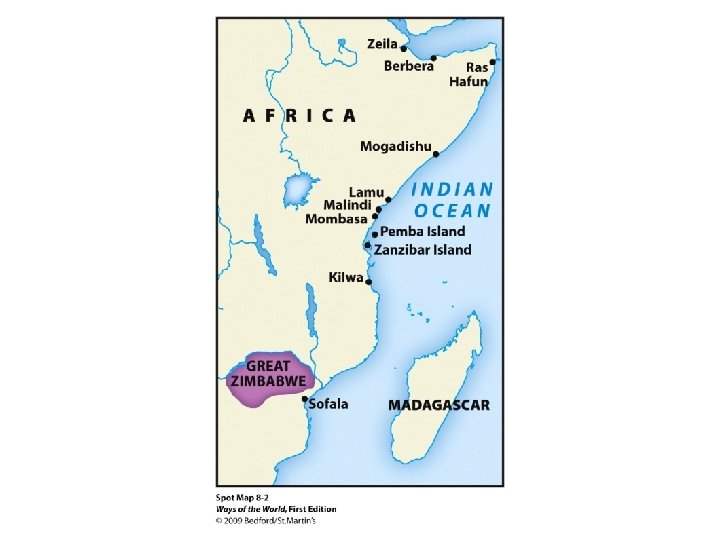 Sea routes: Led to the creation of various states: Srivijaya civilization: Malay sailors gained control of the Straits of Malacca ca. 350 CE. Srivijaya came to dominate trade in this region from 670 -1025 CE. Adopted Buddhism and became major center Swahili civilization: Grew from demand for East African products: gold, ivory, quartz, leopard skins, slaves, iron, wood Flourished 1000 -1500 CE Very urban and city-state oriented Sharp class distinctions Most trade in Arab ships Great Arab and Muslim influence Trade for gold led to Great Zimbabwe, 1250 -1350 CE