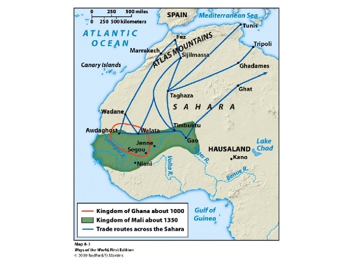 Sand Roads: Exchange across the Sahara • Commercial Beginnings in West Africa: – North had manufactured goods, salt, horses, cloth, dates – South had crops, gold, ivory, kola nuts, slaves • • Introduction of camel was crucial, early in CE Regular trans-Saharan commerce by 300 -400 CE Huge caravans, up to 5000 camels Led to a number of states in western and central Sudan: Ghana, Mali, Songhay, Kanem, and Hausaland. • Slaves came mostly from south, most sold in North Africa.