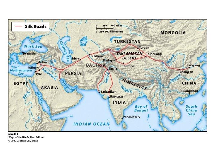 Silk Roads: Exchange across Eurasia • Disease in Transit • Long-distance trading led to spread of disease • Most lethal junctures: when an unfamiliar disease arrives in a new culture • Athens, 430 -429 BCE, infect from Egypt • Smallpox and measles periodically ravaged the Roman and Han empires. • 534 -750 CE bubonic plague from India to Mediterranean region • Black Death, but much later and largely due to Mongol Empire • Strengthened Eurasians over the long run.