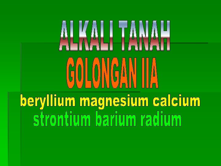 Energi ionisasi (k. J mol-1 )1 st Energi ionisasi (k. J mol-1 ) 2 nd Be 899. 4 1757. 1 Mg 737. 7 1450. 7 Ca 589. 7 1145 Sr 549. 5 1064. 2 Ba 502. 8 965. 1