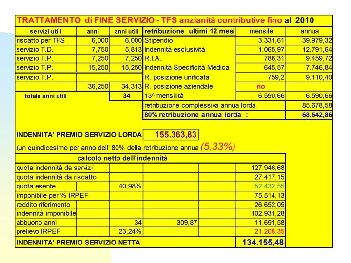 Trattamento Fine Servizio - TFS contributo all’ex INADEL : 6, 10% (2, 5% trattenuto + 3, 6% a carico ASL) misura dell’indennità un 15° per anno utile dell’ 80% della retribuzione annua alla cessazione attività ESEMPIO: - retribuzione annua ultimi 12 mesi € 80. 000, 00 - 80% della retribuzione 64. 000, 00 - 1/15° (64. 000, 00 : 15) 4. 266, 67 - anni utili: 38 TFS = 38 x € 4. 266, 67 € € =€