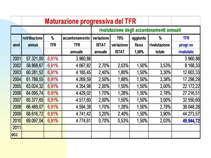 perc. c. ) dipendenti Trattamento Fine Rapporto - TFR (ex art. 2120 assunti trattenuta di invarianza stipendiale pari al 2, 5% - accantonamenti - rivalutati annualmente con il 75% della variazione ISTAT, aumentata dell’ 1, 5% dal 1. 1. 2001 6, 91% della retribuzione annua adesione volontaria ai FONDI PENSIONE Per i dipendenti pubblici che hanno il TFR deve ancora essere emanata una specifica normativa in ordine al silenzio assenso per i conferimento del TFR ai Fondi Pensione