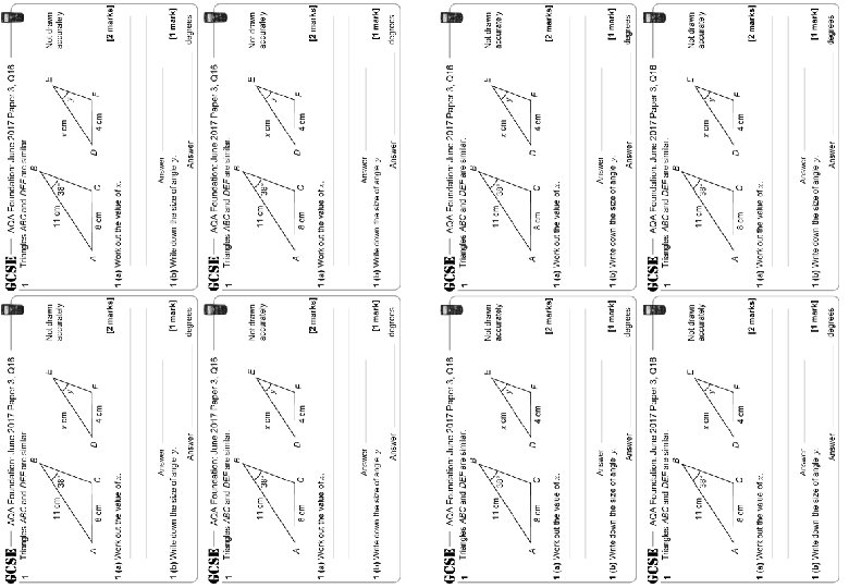 Similar Triangles – Foundation – GCSE Questions – AQA These questions are the same format as previous GCSE exams. COPY means they use the exact same numbers as the original GCSE question. Otherwise, they are clone questions using different numbers. The worksheets are provided in 2 sizes.