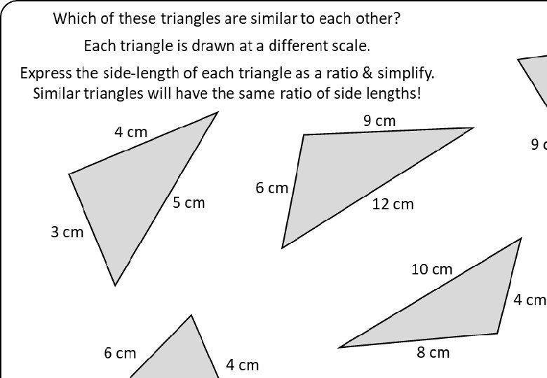 Which of these triangles are similar to each other? Each triangle is drawn at a different scale. Express the side-length of each triangle as a ratio & simplify. Similar triangles will have the same ratio of side lengths! 3: 4: 5 6 cm 5 cm 2: 3: 3 9 cm 4 cm Not to scale. 6 cm 9 cm 2: 3: 4 6 cm 2 cm 8 cm 1. 5 cm 2: 3: 4 12 cm 3 cm 4 cm 2: 4: 5 3 cm 10 cm 2: 4: 5 6 cm 7. 5 cm 4 cm 8 cm 12 cm 6 cm 1. 5 cm 10 cm 2: 4: 5 10 cm 2: 3: 5 6 cm 12. 5 cm 10 cm 8 cm 10 cm 6 cm 2: 5: 5 12 cm 2: 3: 4 2 cm 3: 5: 5 4 cm 2: 3: 3 1 cm 3: 4: 5 4 cm 15 cm 3: 4: 5 6 cm 2: 4: 5 12 cm 6 cm 3. 5 cm 1: 4: 5 17. 5 cm 14 cm 6 cm