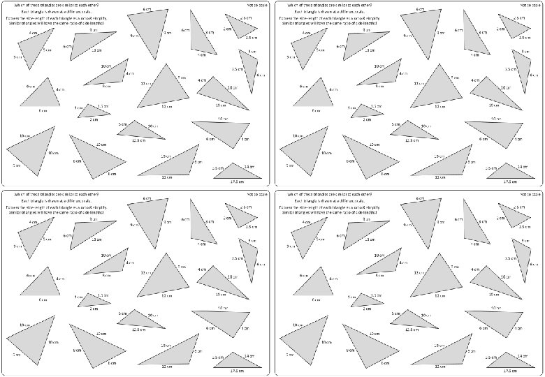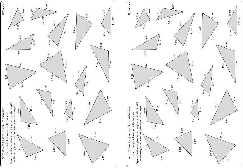 Which of these triangles are similar to each other? Not to scale. 6 cm Each triangle is drawn at a different scale. 2. 5 cm Express the side-length of each triangle as a ratio & simplify. Similar triangles will have the same ratio of side lengths! 9 cm 4 cm 9 cm 6 cm 5 cm 6 cm 2 cm 8 cm 1. 5 cm 12 cm 3 cm 4 cm 3 cm 10 cm 7. 5 cm 4 cm 6 cm 1. 5 cm 6 cm 4 cm 10 cm 12 cm 10 cm 2 cm 5 cm 10 cm 6 cm 12 cm 8 cm 4 cm 15 cm 8 cm 6 cm 14 cm 3. 5 cm 6 cm 12 cm 17. 5 cm