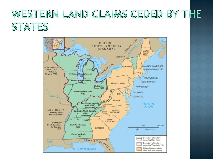 � Native Americans lost out when British left � 1781—Virginia took lead in ceding western claims to Congress � Other states ceded claims to Congress � Congress gained ownership of all land west of Appalachians � This was a major development for the future of the country.