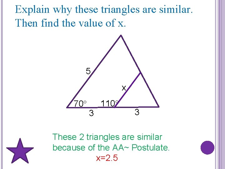 Explain why these triangles are similar. Then find the value of x. 5 x 70 3 110 3 These 2 triangles are similar because of the AA~ Postulate. x=2. 5