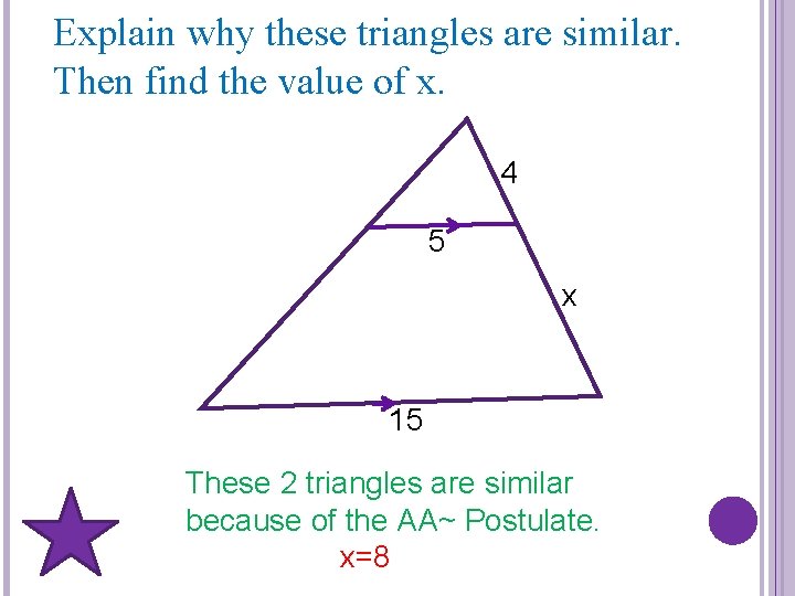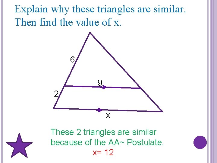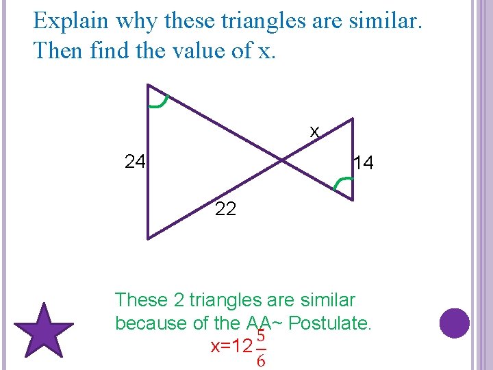 Explain why these triangles are similar. Then find the value of x. x 7. 5 12 18 These 2 triangles are similar because of the AA~ Postulate. x= 15