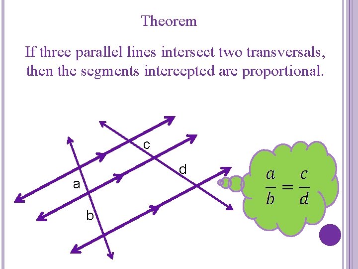 Theorem If three parallel lines intersect two transversals, then the segments intercepted are proportional. c d a b