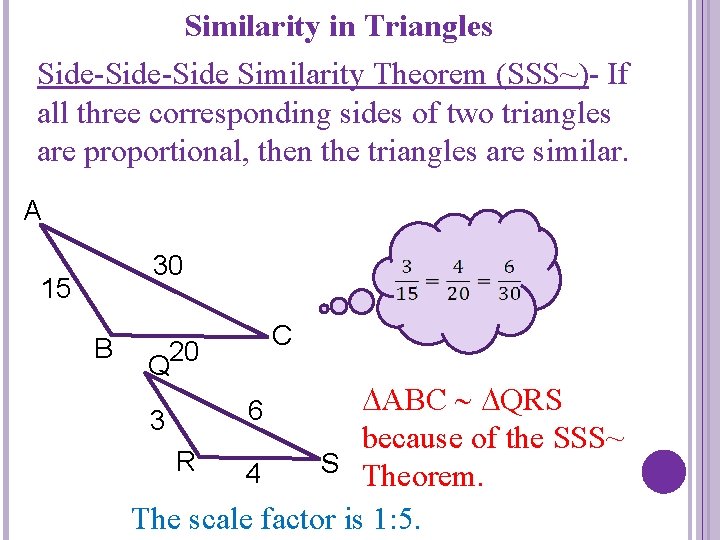 Similarity in Triangles Side-Side Similarity Theorem (SSS~)- If all three corresponding sides of two triangles are proportional, then the triangles are similar. A 30 15 B C Q 20 ABC QRS 3 because of the SSS~ R S Theorem. 4 The scale factor is 1: 5. 6