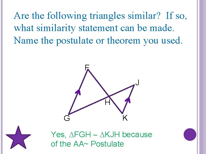 Are the following triangles similar? If so, what similarity statement can be made. Name the postulate or theorem you used. F J H G K Yes, FGH KJH because of the AA~ Postulate