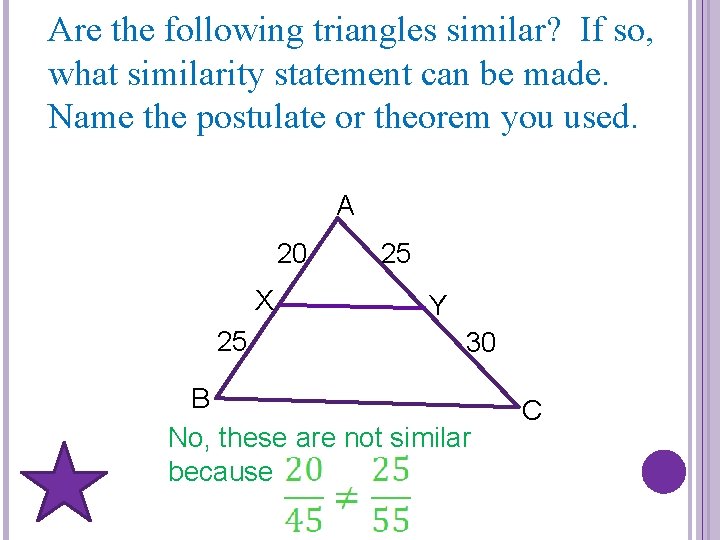 Are the following triangles similar? If so, what similarity statement can be made. Name the postulate or theorem you used. A 20 X 25 25 Y 30 B No, these are not similar because C