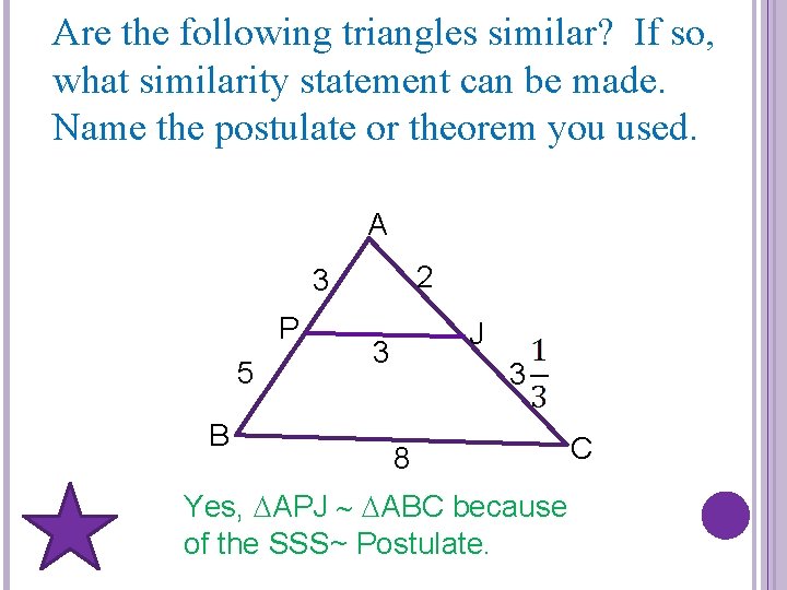 Are the following triangles similar? If so, what similarity statement can be made. Name the postulate or theorem you used. A 2 3 P 5 B J 3 3 8 Yes, APJ ABC because of the SSS~ Postulate. C