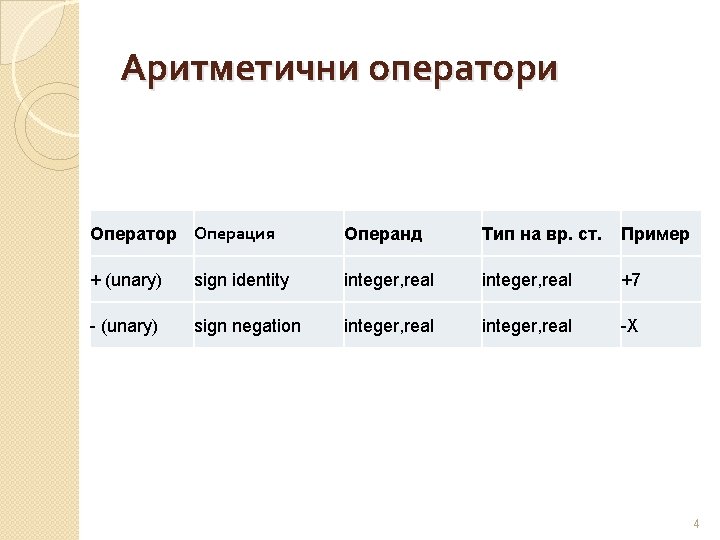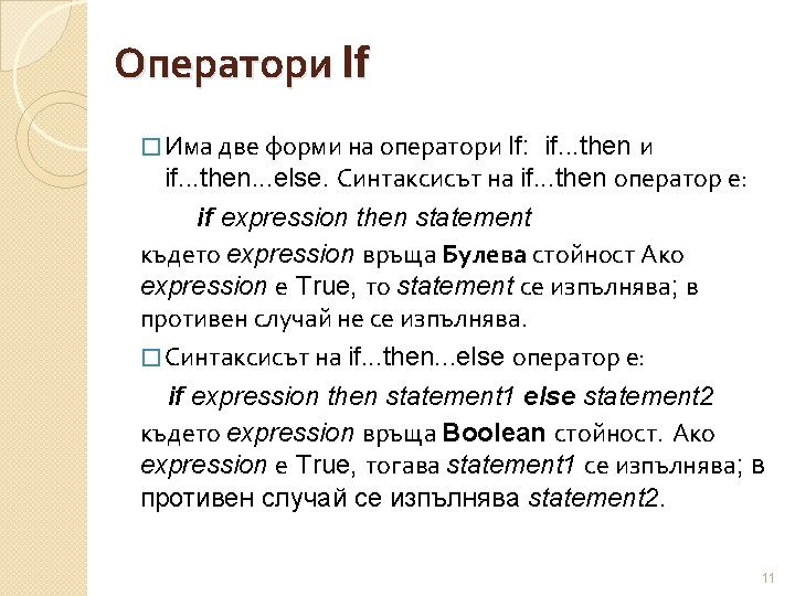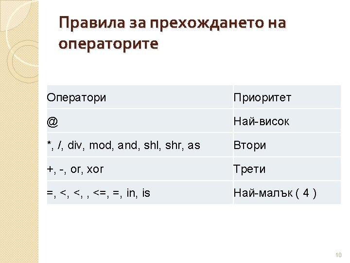 Оператори за отношение Оператор Операция Операнд Резулта Пример т = Равенство simple, class reference, interface, string, packed string Boolean I= Max < Неравенство simple, class reference, interface, string, packedstring Boolean X < Y < По-малко simple, string, packed string, PChar Boolean X < Y > По-голямо simple, string, packed string, PChar Boolean Len X <= По – малко или равно simple, string, packed string, PChar Boolean Cht<= I => По-голямо или равно simple, string, packed string, PChar Boolean I= 1 9