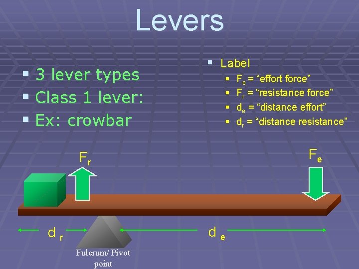 Levers § 3 lever types § Class 1 lever: § Ex: crowbar § Label § § Fe Fr de dr Fulcrum/ Pivot point Fe = “effort force” Fr = “resistance force” de = “distance effort” dr = “distance resistance”