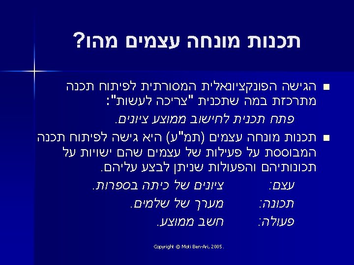 שפות לתכנות מונחה עצמים Simula 1967 n Smalltalk 1972/1980 n Ada 1983/1995 n C++ 1986 n Eiffel 1992 n Java 1995 n C# 2002 n [Pascal 1970] [C 1972] Copyright © Moti Ben-Ari, 2005.