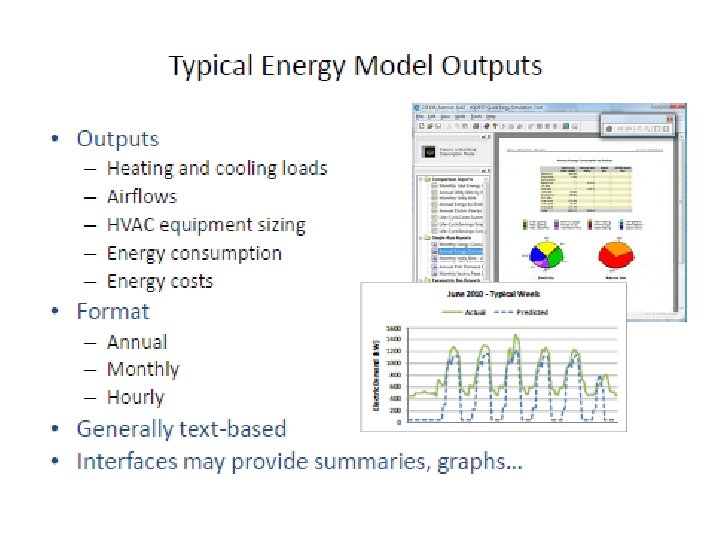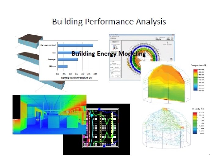 Building simulation tools What is Building Energy Modeling? Building energy estimation using a computer model of energy flow and processes Loads • Determine cooling and heating loads by mathematically simulating thermal performance of the building • Typically hour-by-hour for a full year Energy • Determine energy use over the course of a year by mathematically simulating the performance of HVAC equipment in response to these loads Cost • Calculate operating costs using the energy data
