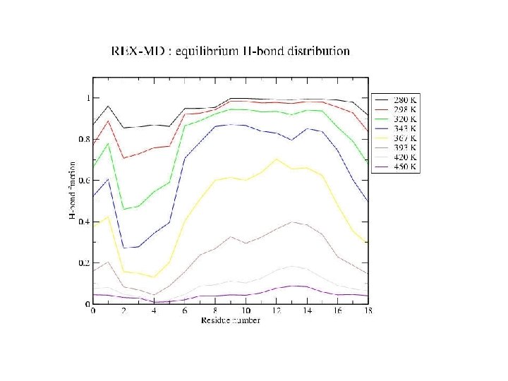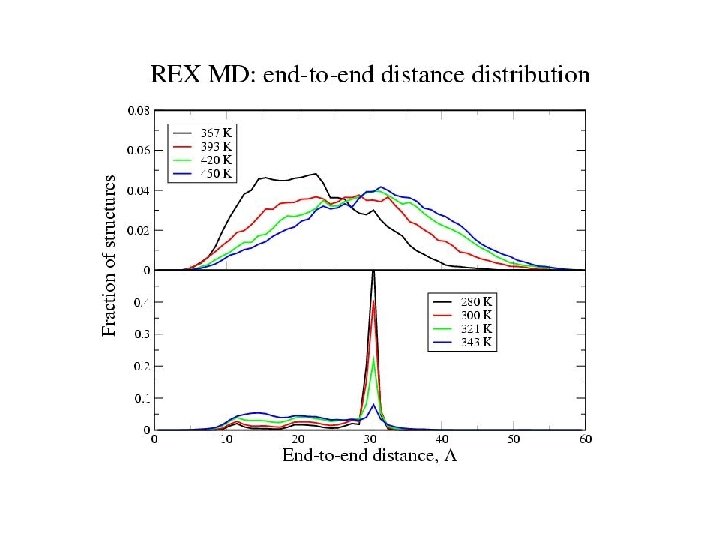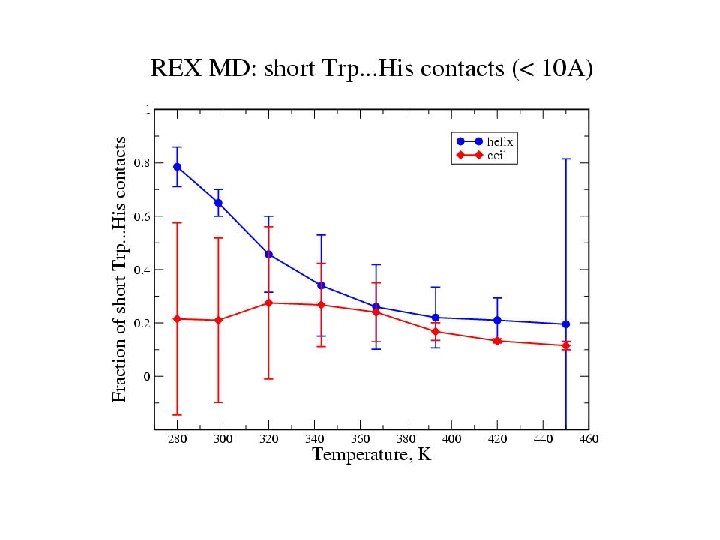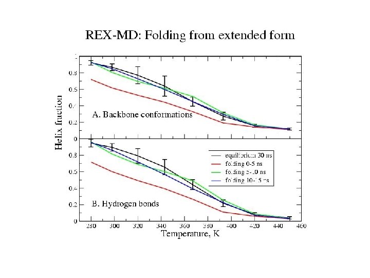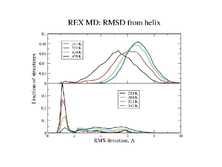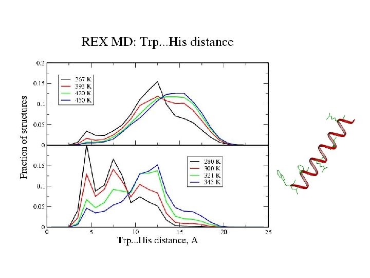 21 -residue helix-forming peptide Blocked peptide: Ac-WAAAH+-(AAARA)3 -A-NH 2 21 residues Simulation 1: equilibrium distribution start: helix trajectory: 30 ns Simulation 2: folding start: extended trajectory: 15 ns Method: CHARMM with CMAP electrostatics: GBMV nonpolar: DGnp=- g DA with g = 4 cal/(mol Å2) REMD at 8 temperatures, 280 -450 K MMTSB tool kit (C. L. Brooks, Scripps)
