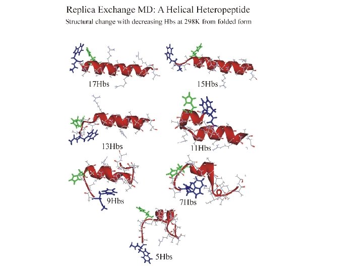 Hydrogen bonds: HB: Oi…Ni+4 < 4. 0 Å f = <NHB>/17 Backbone conformations: population of residues within 30 o of (f, y) = (-62 o, -41 o) DH Data points with error bars: from 15 -30 ns of REMD simulation Solid lines: from fit to van’t Hoff equation DS Tm kcal/mol cal/(mol K) REMD -10 -30 Experiment -12 -40 K 330 -350 296