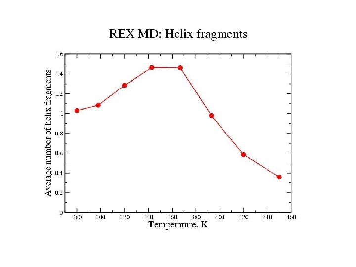 REMD simulation of helix-coil equilibrium Replica-exchange MD: Propagate independent trajectories at temperatures T 1 > T 2 > T 3 … Stop and compare energies Exchange between neighbors T 1 T 2 T 3 T 4