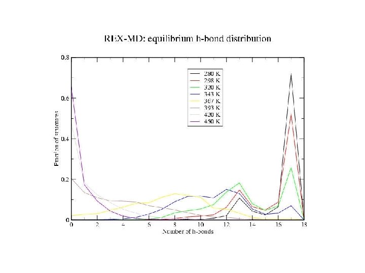 Zimm-Bragg Parameters Statistical weights partition function coil : 1 helix with h-bond: w=s helix without h-bond: v = s 1/2 REMD results at 300 K: helix fraction = 0. 78 number of helix fragments = 1. 08 w = 1. 86 v = 0. 11 Previous Ala-based peptide simulations: w = 1. 12 – 2. 12 v = 0. 06 – 0. 30