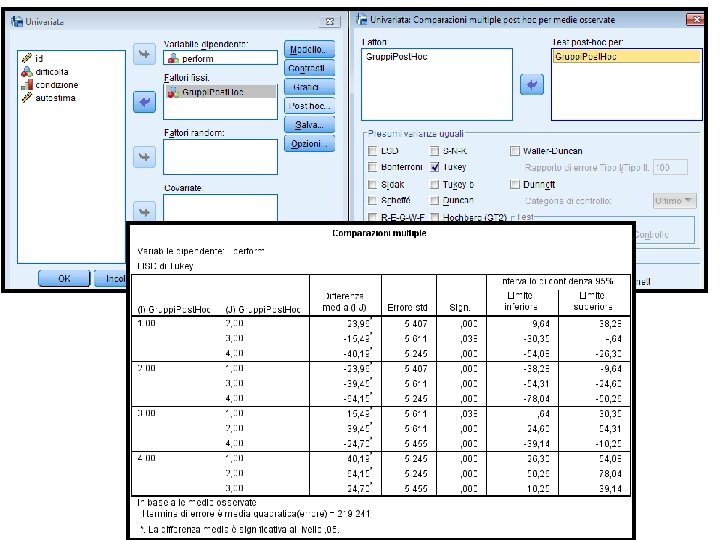 Domanda 2 Adesso possiamo fare un’anova univariata, usando la nuova variabile Gruppi. Post. Hoc come indipendente e performance come dipendente. Chiedendo i post-hoc avremo la risposta alla domanda 2