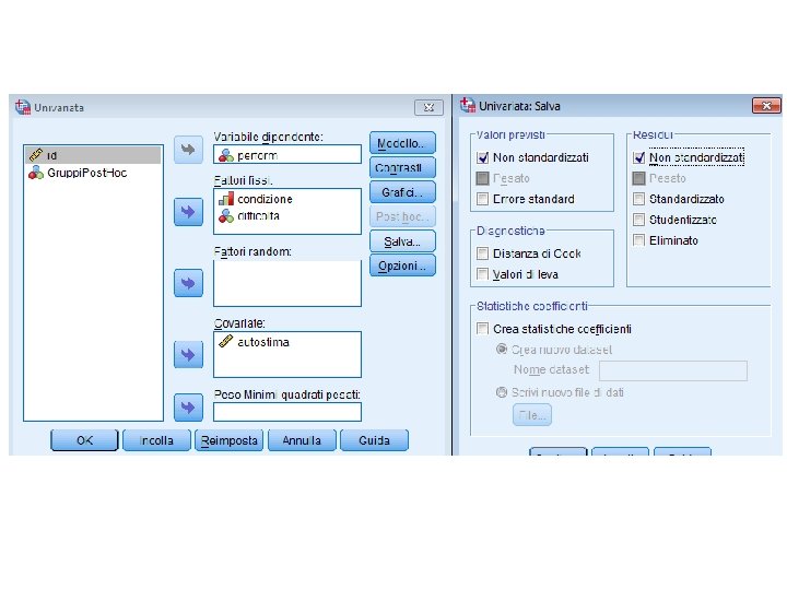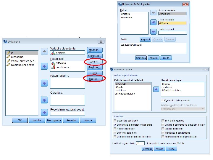 Perché è sbagliato? Cosa vogliamo fare? Confrontare le medie di 4 gruppi: 1. Difficoltà = facile & Condizione = individuale 2. Difficoltà = facile & Condizione = sociale 3. Difficoltà = difficile & Condizione = individuale 4. Difficoltà = difficile & Condizione = sociale Cosa fa il metodo sbagliato illustrato prima? Cerca di confrontare i gruppi Difficoltà facile vs. difficile (al netto di condizione) e Condizione sociale vs. individuale (al netto di difficoltà). Ovviamente i post-hoc su variabili con due livelli non hanno senso, quindi SPSS vi restituisce quel messaggio.