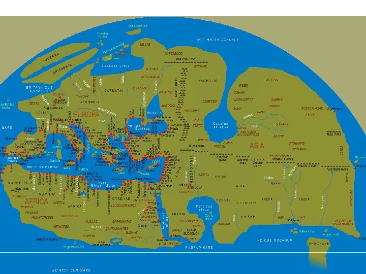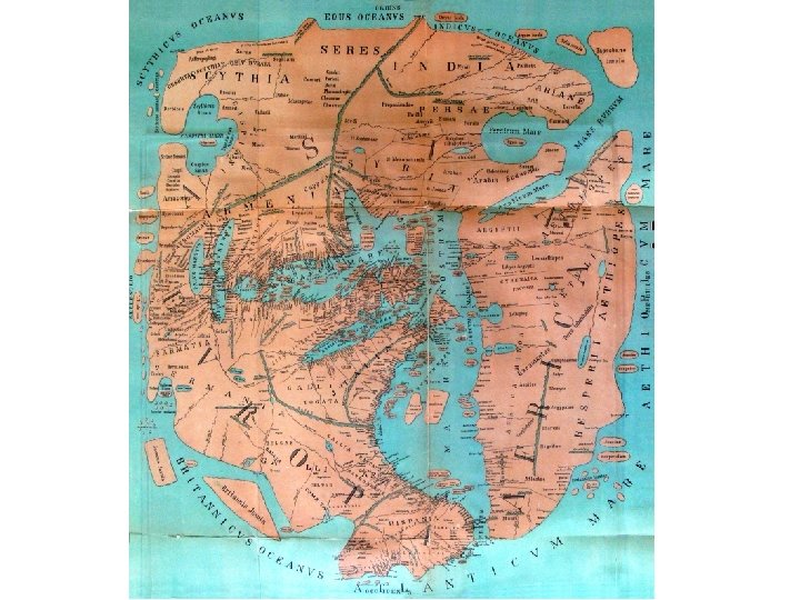 THE WORLD ACCORDING TO POMPONIUS MELA (43 A. D. ? ) Latin text at http: //www. hs-augsburg. de/~harsch/Chronologia/Lspost 01/Pomponius/pom_orbi. html • Eurasia and Africa completely surrounded by sea but Asia and Africa imagined much smaller than in reality. • A hypothetical continent south of the equator but assumed to be inaccessible because of the unbearably hot zone separating it from Africa. • The Caspian Sea as a gulf connected to the Arctic Ocean. • The `Seres’ in the middle of Asia’s eastern coast.