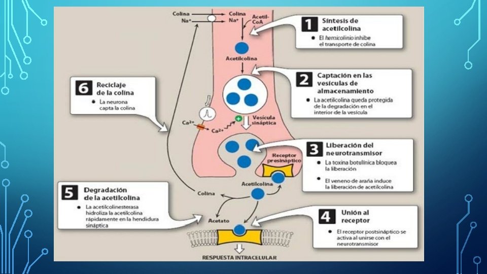 SECRESIÓN DE ACETILCOLINA (ACh) La acetilcolina debe ser liberada de la neurona para viajar hasta la neurona receptora. Para que la acetilcolina sea liberada, un potencial de acción debe alcanzar la terminal nerviosa en la que se encuentra el neurotransmisor. Cuando esto sucede, el mismo potencial de acción genera un potencial de membrana, hecho que motiva la activación de los canales de calcio. Debido al gradiente electroquímico, se genera un influjo de iones de calcio que permiten que las barreras de la membrana se abran y la acetilcolina pueda ser liberada.