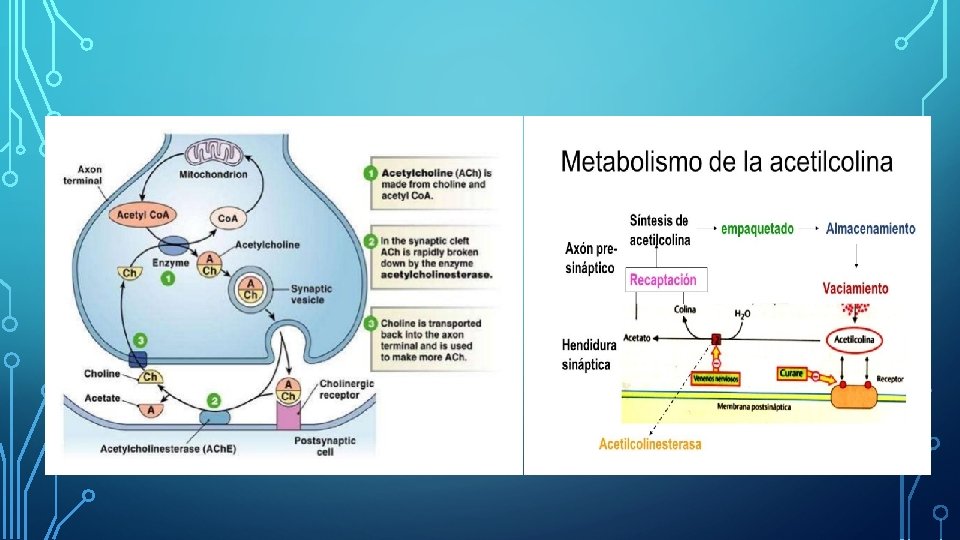 SÍNTESIS DE ACETILCOLINA La síntesis de acetilcolina se produce en el interior de las neuronas, concretamente en su citoplasma, mediante la unión de ácido acético o acetil-Co. A y colina gracias a la enzima colinacetiltransferasa. Tras ello, la acetilcolina es enviada a lo largo del axón hasta el botón terminal, donde será almacenada hasta su utilización y liberación en el espacio sináptico.