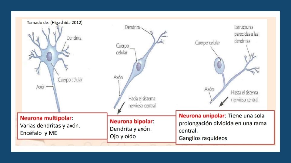 LA NEURONA Las neuronas presentan unas características morfológicas típicas que sustentan sus funciones: un cuerpo celular, llamado soma o «pericarion» central; una o varias prolongaciones cortas que generalmente transmiten impulsos hacia el soma celular, denominadas dendritas; y una prolongación larga, denominada axón o «cilindroeje» , que conduce los impulsos desde el soma hacia otra neurona u órgano diana