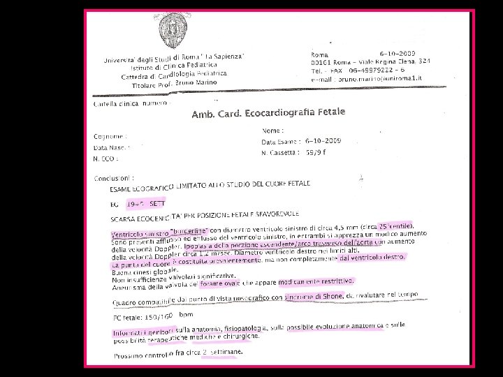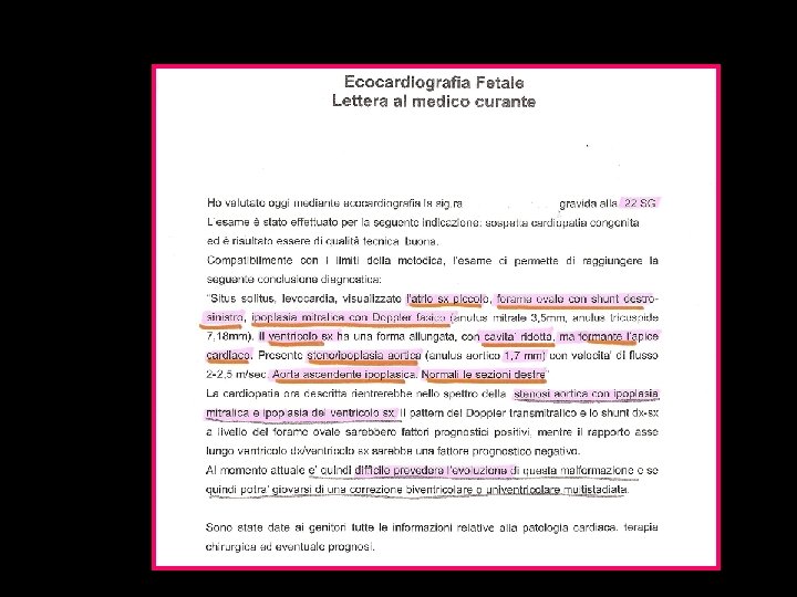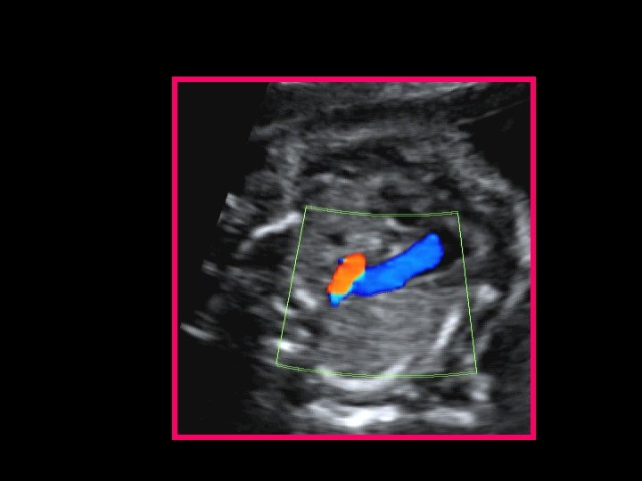 Diagnosi ecografica (2/3 dei casi) • Possibile a 14 -16 settimane (transvaginale) • Solitamente visibile ecocardiografia a 18 -24 s. g. • EVOLUTIVA : a volte non ancora evidente a 20 settimane, visibile al terzo trimestre o diagnosi postnatale üBidimensionale ü Color Doppler