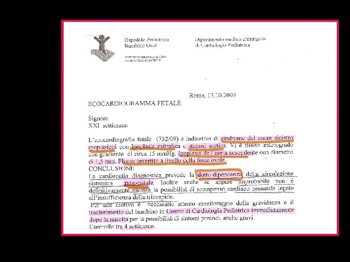 Perché è importante la diagnosi prenatale 1) Cariotipo 2) Ricerca anomalie associate 3) Counseling con i genitori : prognosi outcome 4) Counseling con cardiologo pediatra e cardiochirurgo 5) Pianificare il parto in un centro di III livello 6) IVG