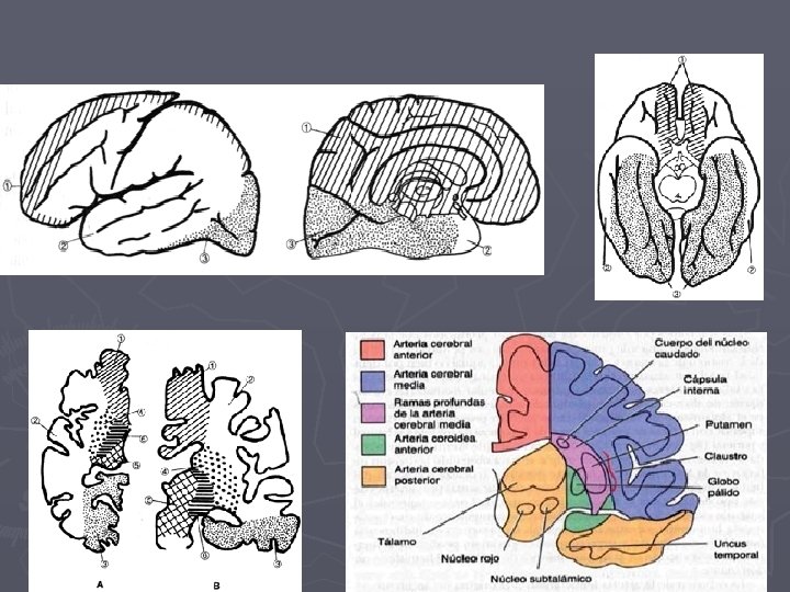 Arteria Cerebral Media ► Ramas § § § superficiales: Lóbulo frontal (áreas 4, 6, 8, y Broca) Lóbulo parietal (áreas 3, 1, 2) y radiaciones ópticas Lóbulo temporal (área de Wernicke) y radiaciones ópticas