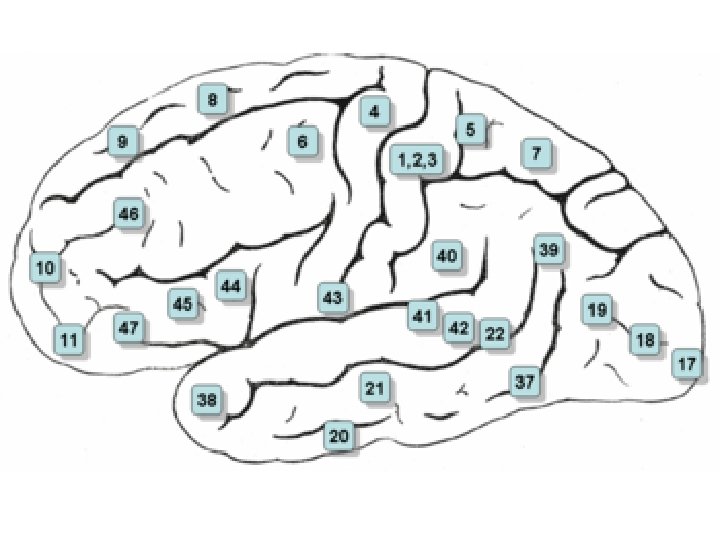 ► LOBULO FRONTAL § Área 44 o de Broca: centro motor del habla § Lesión: afasia motora o de expresión. § Las áreas 45, 46 y 47 corresponden a la corteza motora accesoria del habla.
