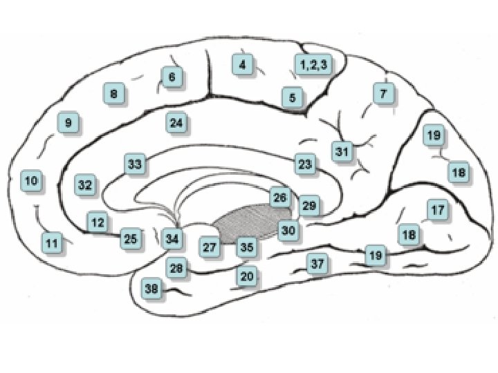 ► LOBULO FRONTAL § Corteza prefrontal: Áreas 9, 10, 11, 12 y 32 asiento de las funciones mentales superiores como memoria, juicio, abstracción, etc. § Lesión: alteraciones de la personalidad y trastornos vegetativos como incontinencia urinaria.