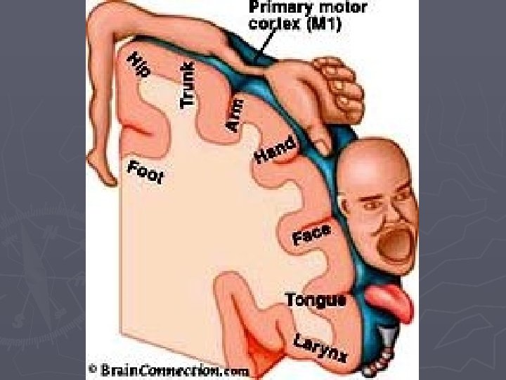 ► LOBULO FRONTAL § Área 4: Área motora primaria, responsable de la motilidad de la cara y miembros contralaterales. Distribución somatotópica. § Lesión: paresia-plejía del hemicuerpo contralateral. § Irritación: movimientos involuntarios del hemicuerpo contralateral