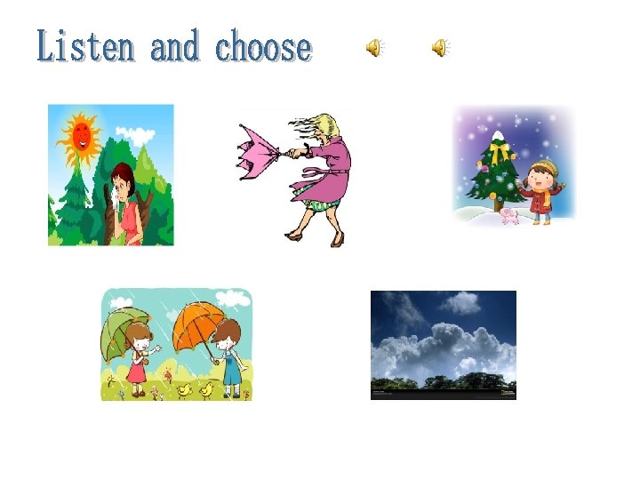sunny windy rainy snowy cloudy MON TUE WED THU FRI SAT SUN snowy windy rainy 猜 weat her 听 windy cloudy sunny weat It’s snowy on Monday. her It’s on. rainy