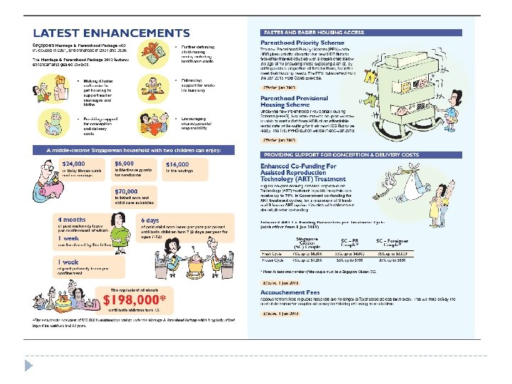 Explaining key features of the policy: To overcome worker shortages, the Singapore government has encouraged immigration, but it is also trying to increase the population through raising birth rates. The government is doing this in a number of ways: 1. 2. 3. It has increased maternity leave and it will cover the cost of maternity leave for the first four babies. This incentive means that parents do not have to worry about the security of their work if they decide to have children which is important due to the high status of women in Singapore and their desire for successful careers. The government is also increasing child benefits paid to families. For example, the government will pay money into a special bank account. By doing this, families do not need to worry about the costs of having children and can instead focus upon the benefits of family life. As an HIC the cost of living is very expensive. The government has also sponsored dating organizations to encourage people to get married earlier and start having children as people are too busy to date due to busy careers.
