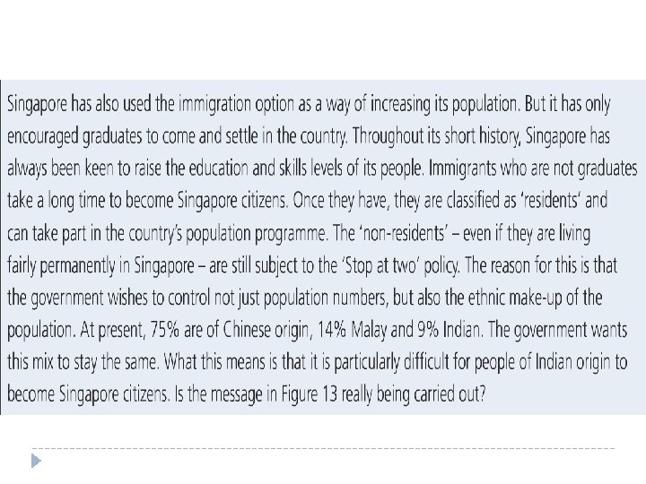 Were there other ways to boost Singapore’s population? � Singapore has experienced that importing foreigners can boost population size and sustain economic growth- but it is only encouraging graduates. � It already has a large amount of foreigners, only 74% are Singaporeans- the government wants the current cultural mix to stay the same- ‘foreigners’ are still subject to the ‘Stop at two’ policy � It could create a wide culture or conflict.