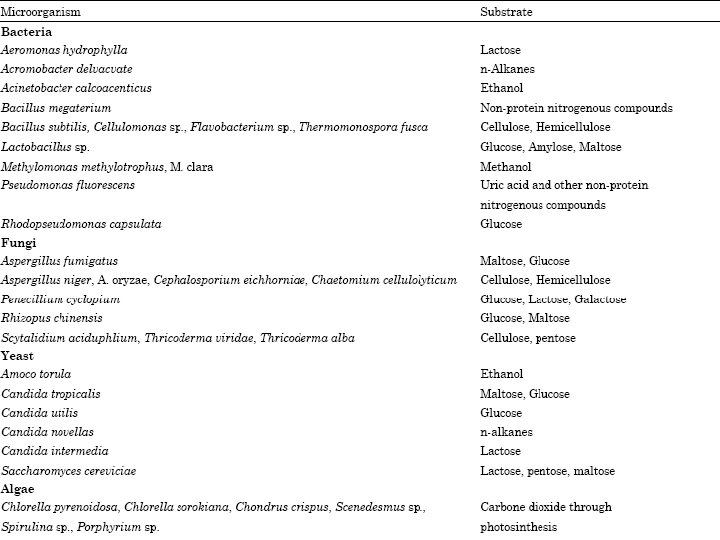 Microorganisms Bacteria Methylophilus methylotrophus Pseudomonas sp. Brevibacterium sp. Yeasts Fungi Lactobacillus bulgaricus Candida lipolytica Bakers yeast Kluyveromyces fragilis Trichoderma viridae Aspergillus niger Actinomycetes Nocardia sp Thermomonospora fusca Mushrooms Agaricus Morchella Vovariella