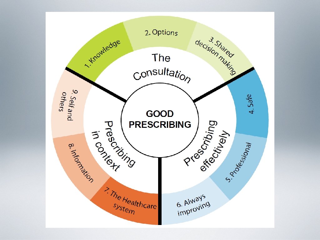 Domain C: Prescribing in context Competency 7: The Healthcare system Understands and works within local and national policies, processes and systems that impact on prescribing practice. Sees how prescribing impacts on the wider healthcare community. Competency 8: Information Knows how to access relevant information. Can use and apply information in practice. Competency 9: Self and others Works in partnership with colleagues for the benefit of patients. Is self-aware and confident in own ability as a prescriber.